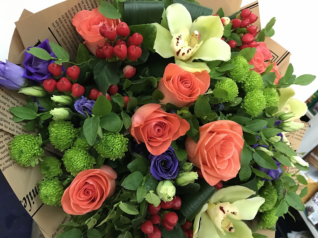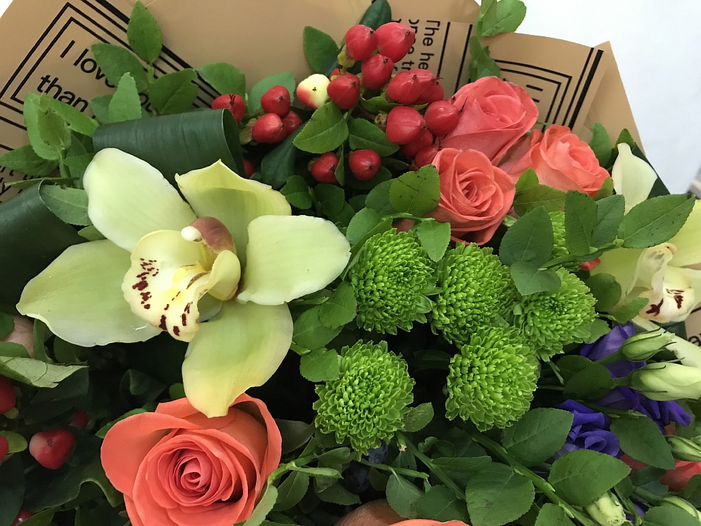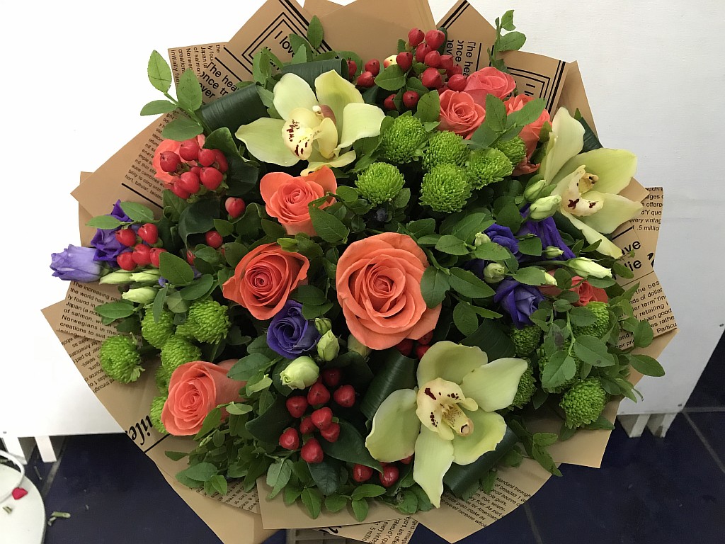 Роза Вау 9 шт, цимбидиум 3 шт, лизиантус 3 шт, сантини 3 шт, гиперикум 3 шт, декоративная зелень, упаковка, атласная лента.