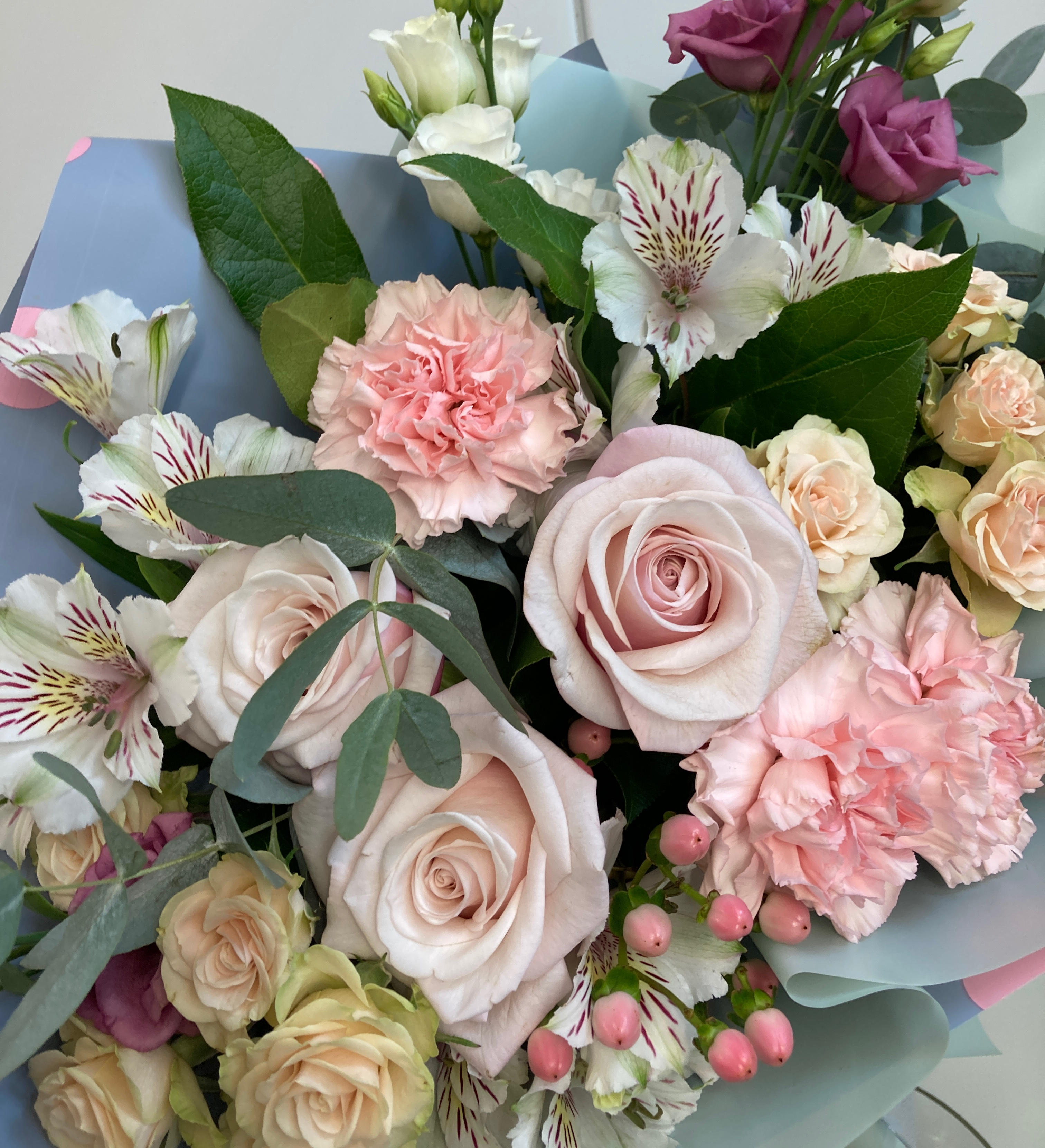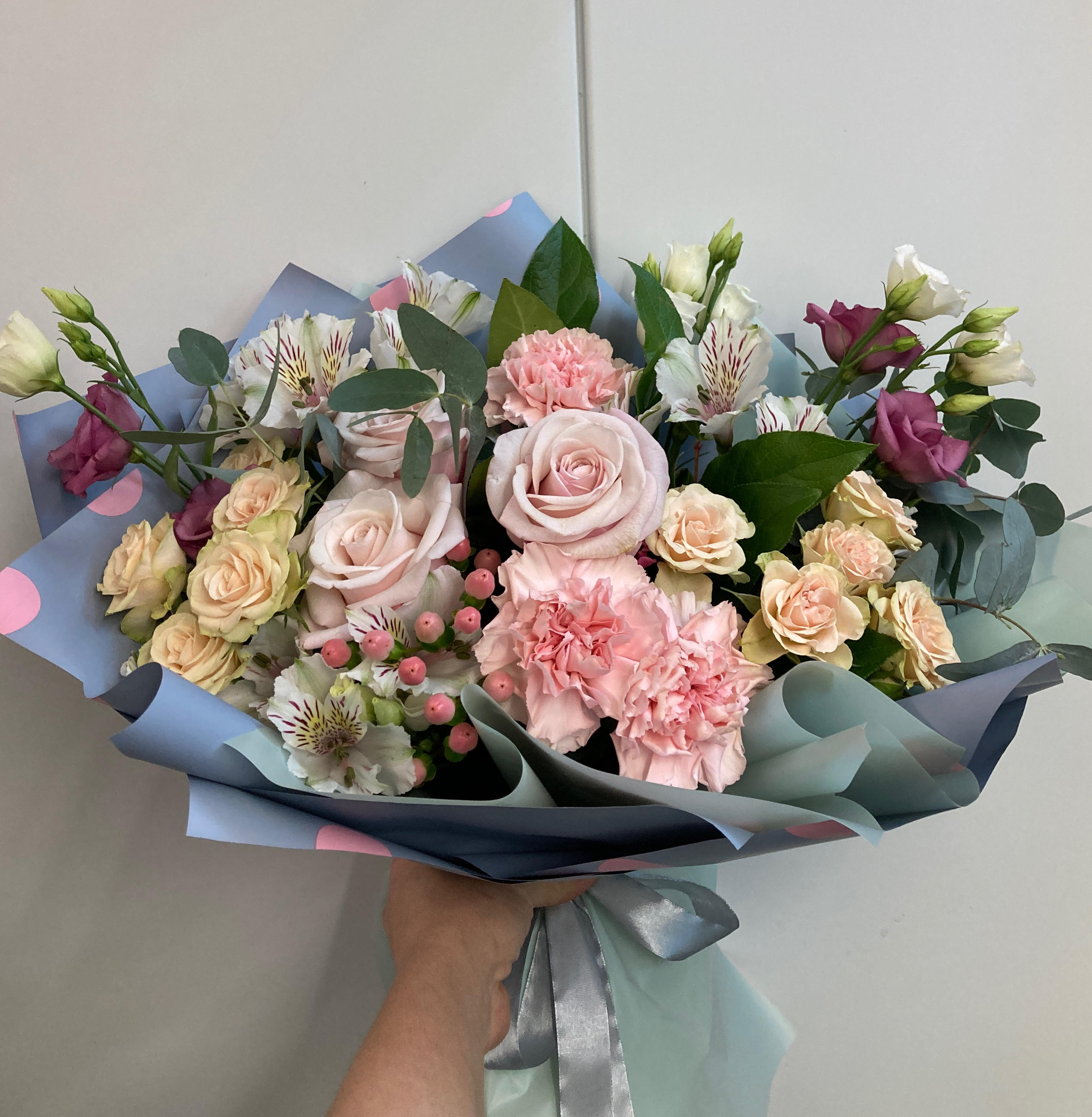 Роза 3 шт, эустома 3 шт, альстромерия 3 шт, роза кустовая 2 шт, гвоздика 3 шт, зелень декоративная, упаковка.