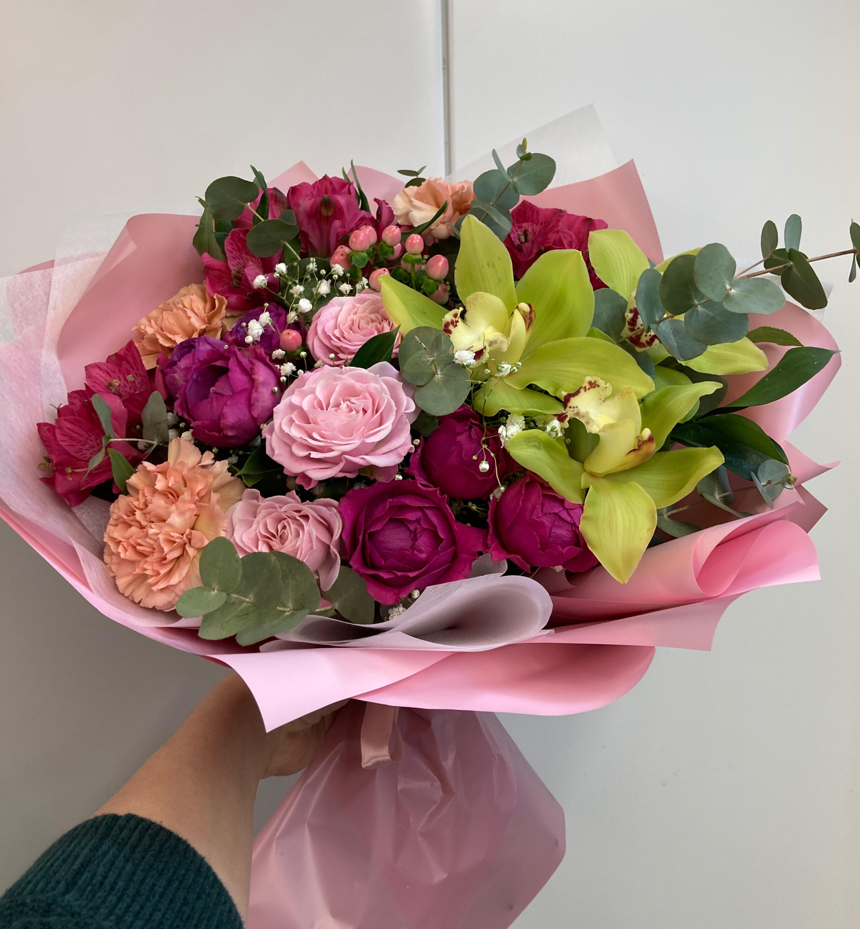 Этот яркий цветочный коктейль из кустовых роз, орхидей, альстомерии притягивает и завораживает взгляд. Прекрасная композиция подойдет к любому случаю и, несомненно, порадует получателя.