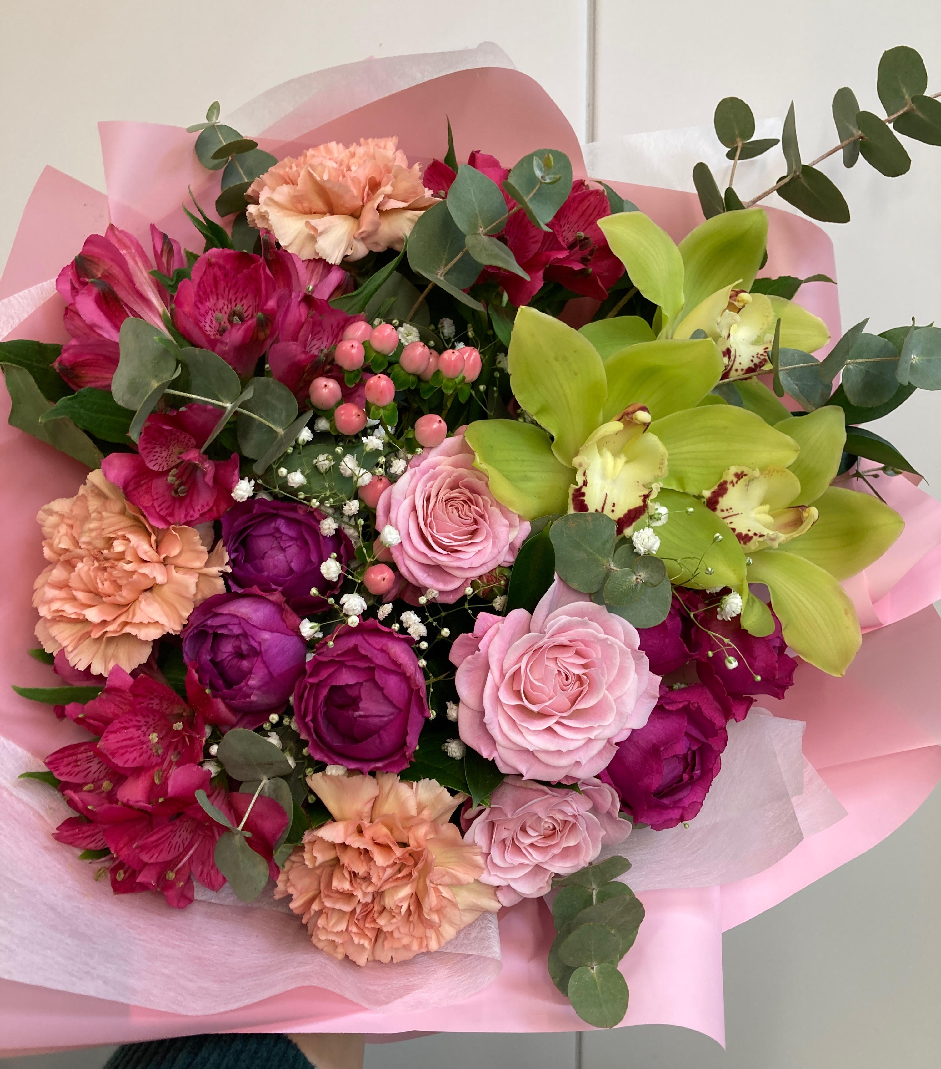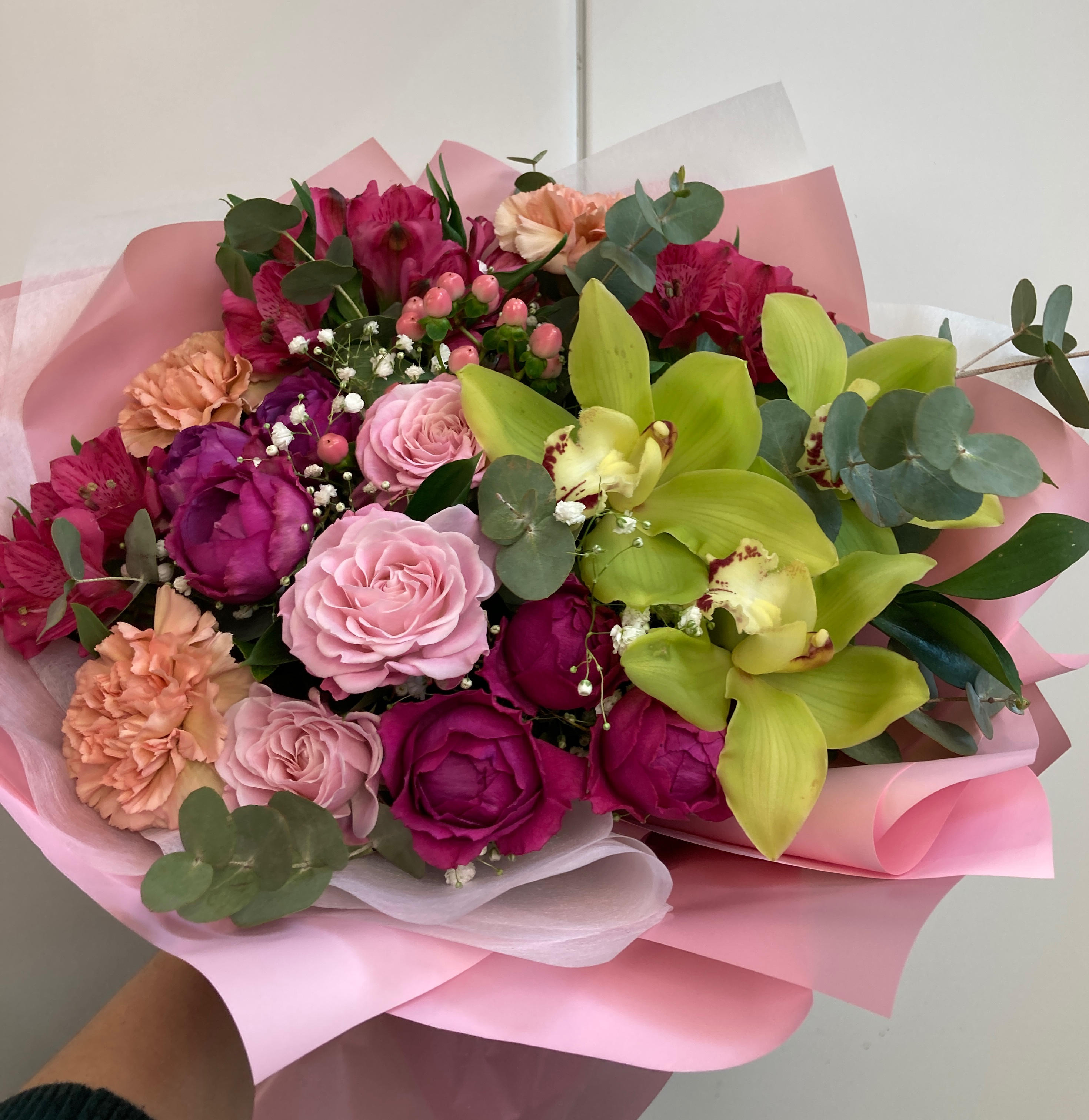 Орхидея 3 шт, альстромерия 3 шт, роза кустовая пионовидная 3 шт, гвоздика 3 шт, зелень декоративная, упаковка.