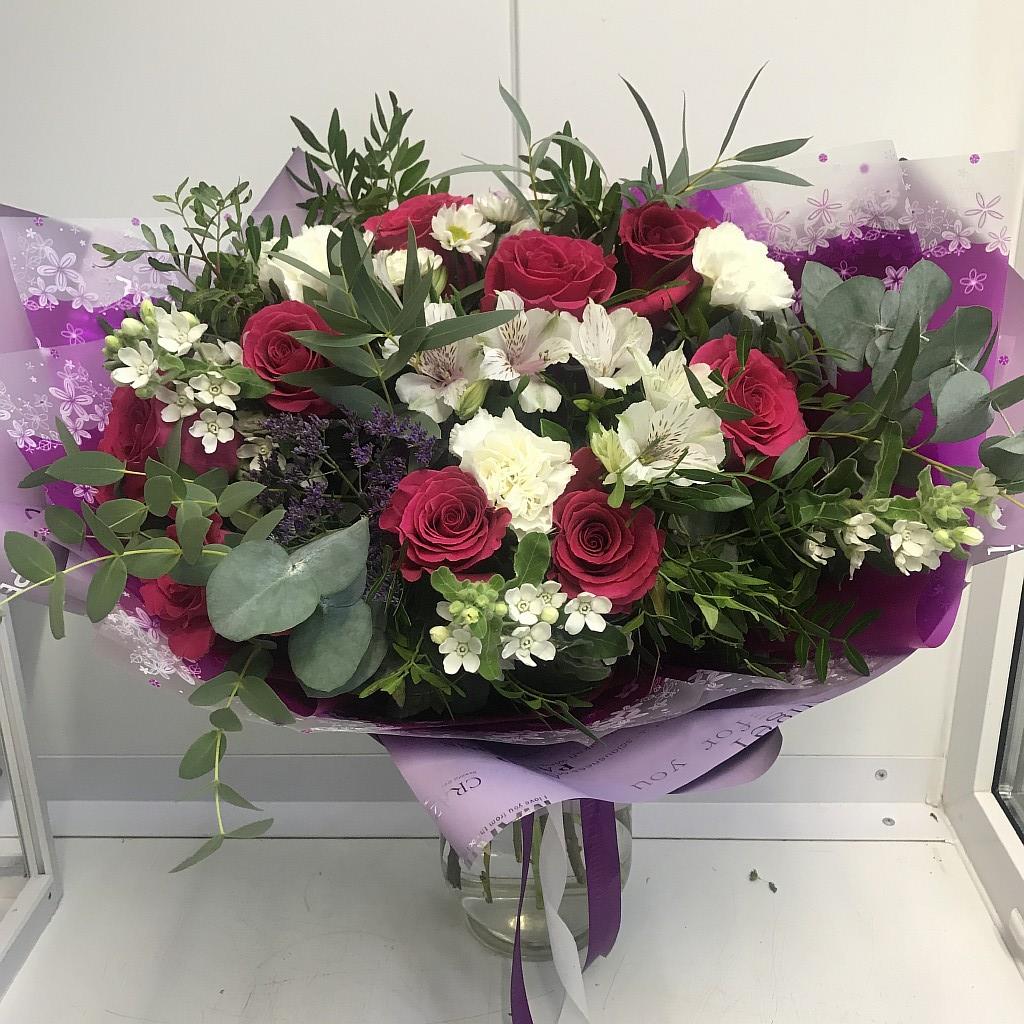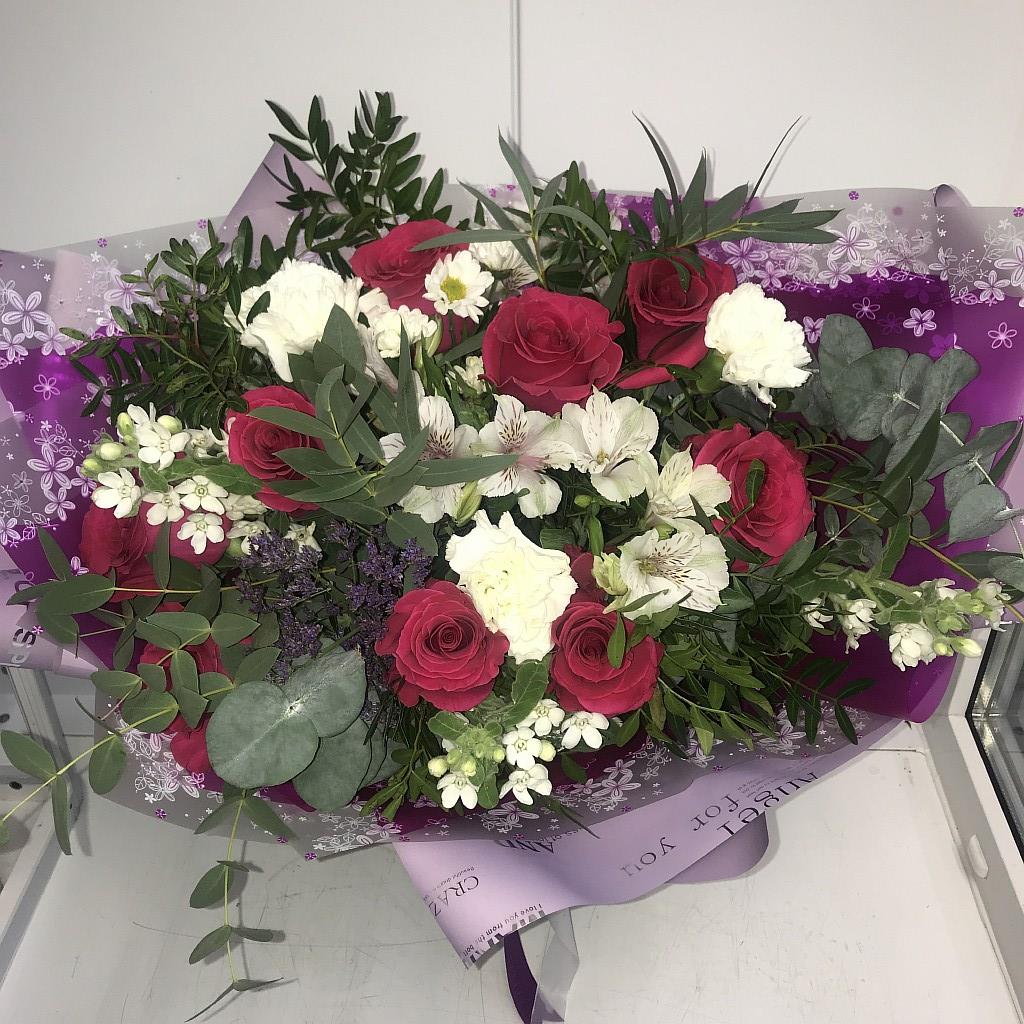 Романтичная, элегантная композиция, дышащая свежестью. Сочетание ярко-розовых и белых цветов, утопающих в озере декоративной зелени, обрамленных яркой упаковочной бумагой – идеальный подарок к любому торжеству.