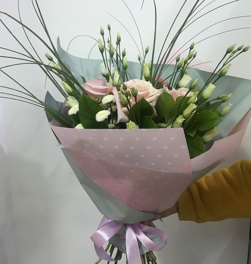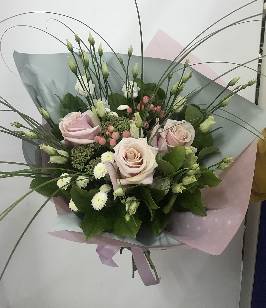 Роза 3 шт, эустома 3 шт, сантини 2 шт, гиперикум 2 шт, декоративная зелень, упаковка, лента атласная.