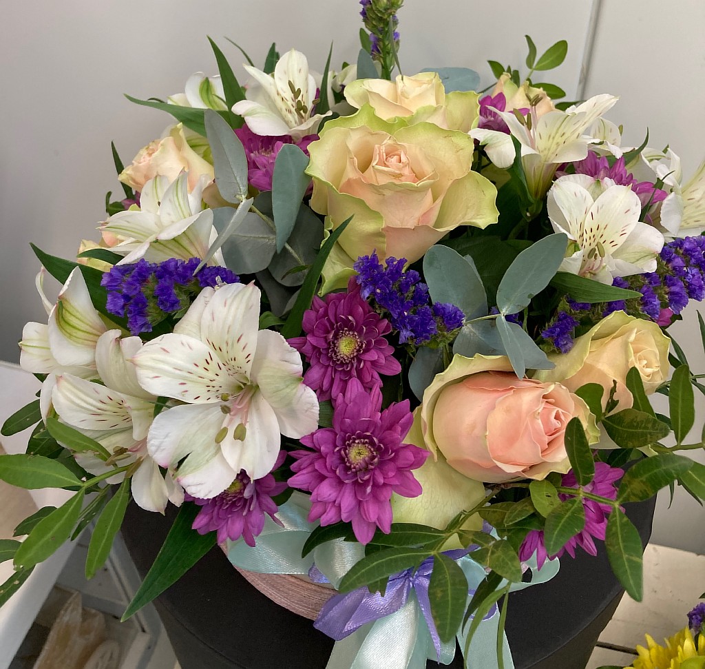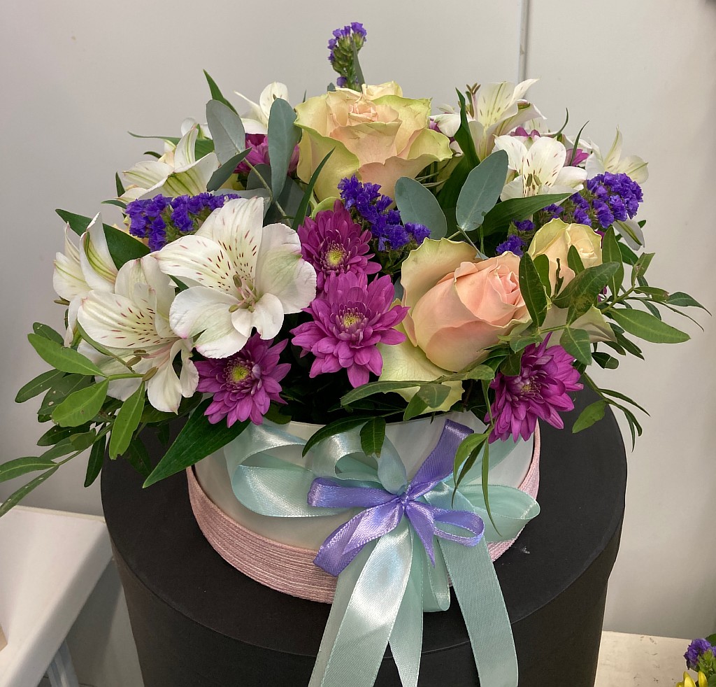 Роза 7 шт, альстромерия 3 шт, хризантема 2 шт, статица 1 шт, зелень декоративная в шляпной коробке.