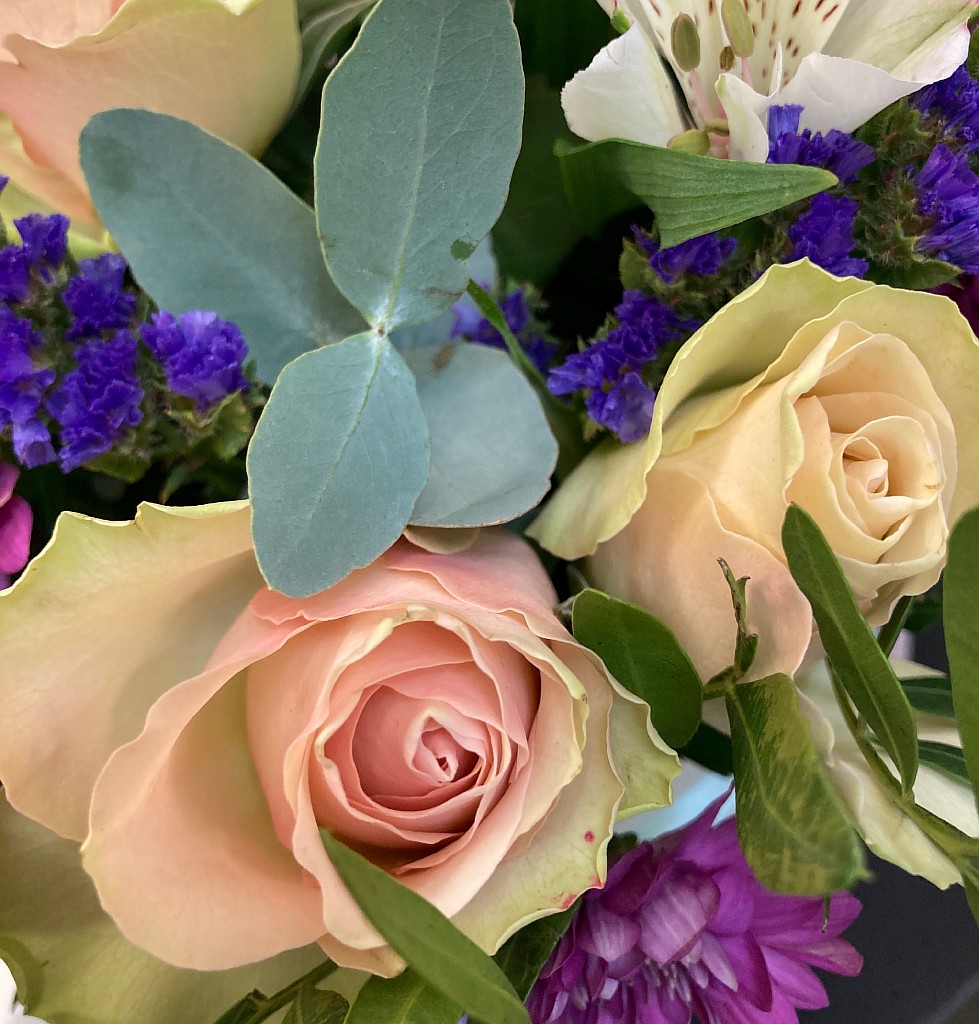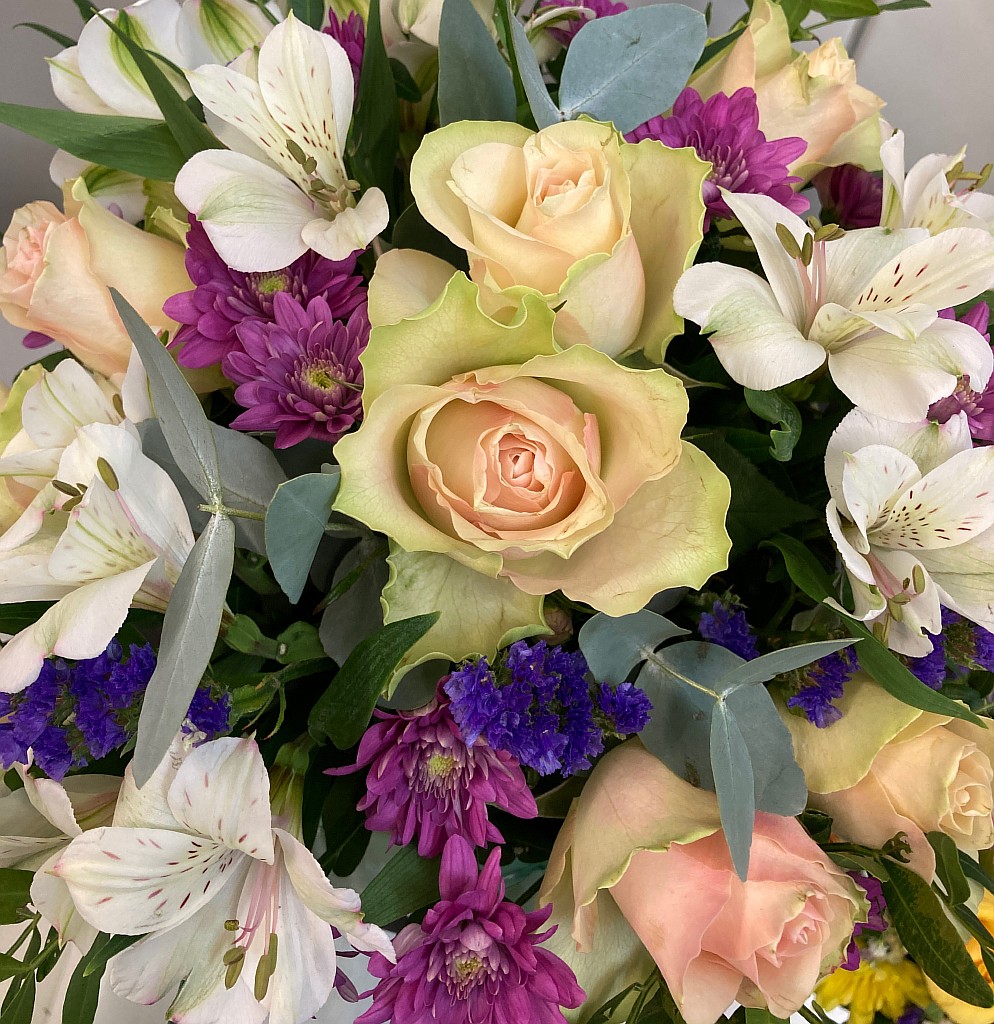Нежная, свежая, светлая композиция из альстомерий и роз, чьи оттенки подчеркнуты соцветиями статицы – великолепный комплимент для романтичных натур.